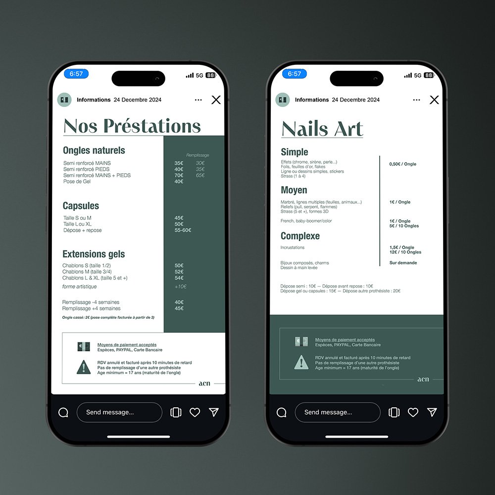 Calamity Nails est un salon de prothésie ongulaire qui allie style et expertise pour offrir des prestations soignées et tendance. Avec une identité affirmée et un univers visuel marquant, le salon souhaitait se doter d’une communication à son image : professionnelle, moderne et impactante. L’objectif était de concevoir des supports graphiques harmonieux et cohérents, permettant de renforcer la visibilité du salon et d’attirer une clientèle en quête d’un service de qualité.